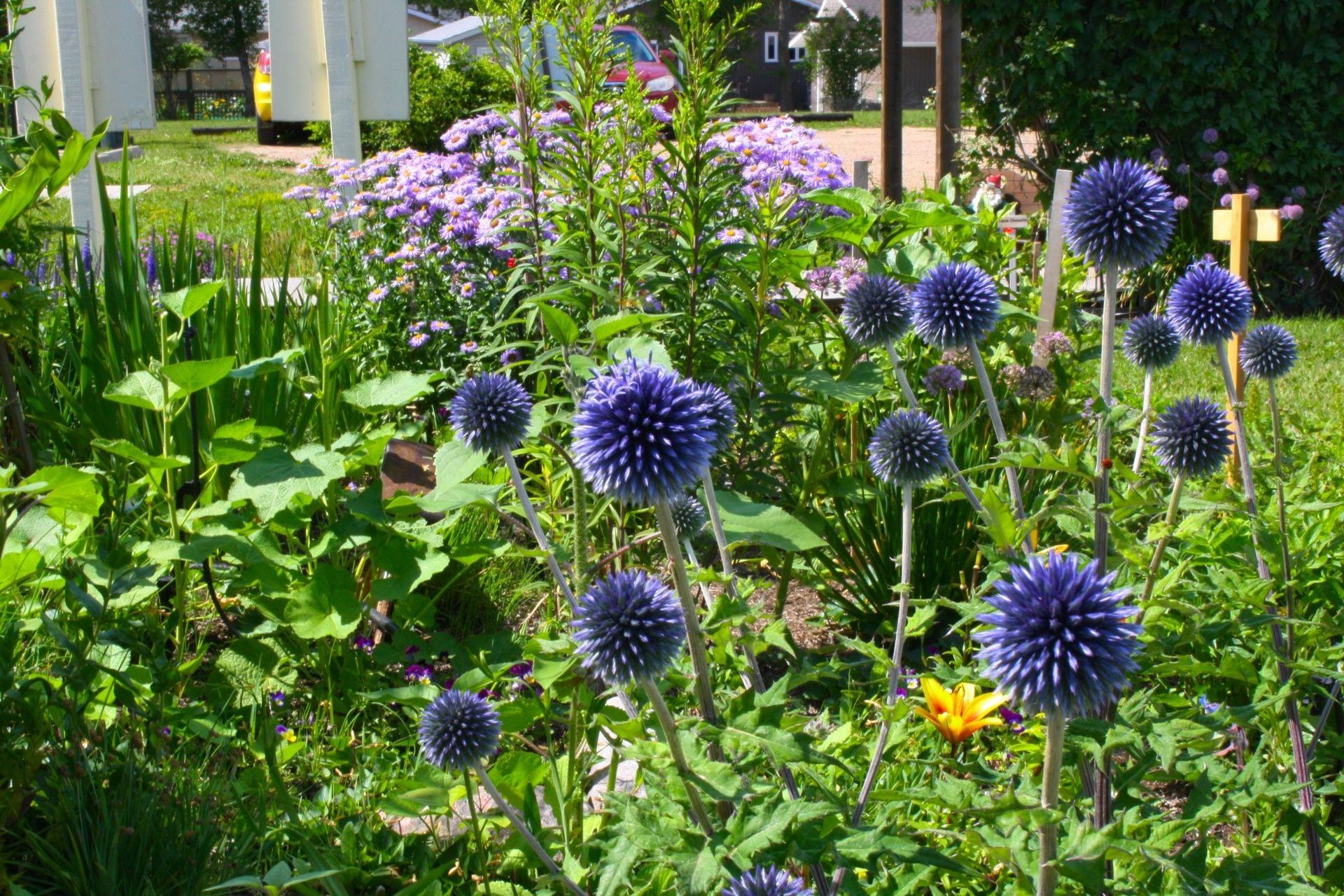 The Globe thistle is a fast-growing perennial with spherical blue, purple, or white flowers that bloom mid-summer to fall. It is native to southern and eastern Europe, and western Asia, and thrives in dry soil with full sun. Globe Thistle can be used in medicine as an antioxidant, as well as in culinary uses.