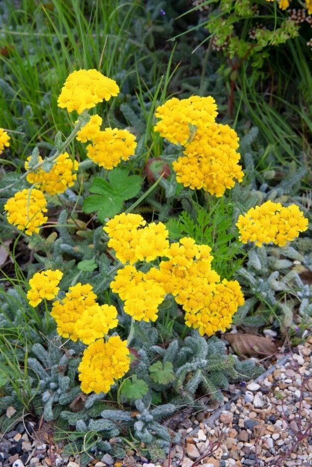 Woolly Yarrow is a low-growing, mat-forming perennial with silvery, fuzzy leaves and bright yellow flower clusters that bloom in early summer. Native to Europe, it thrives in full sun and dry, well-drained soil. Ideal for rock gardens and edging, it is drought-tolerant and deer-resistant. Like common yarrow, it has historical medicinal uses, including as an astringent and wound treatment. Allium