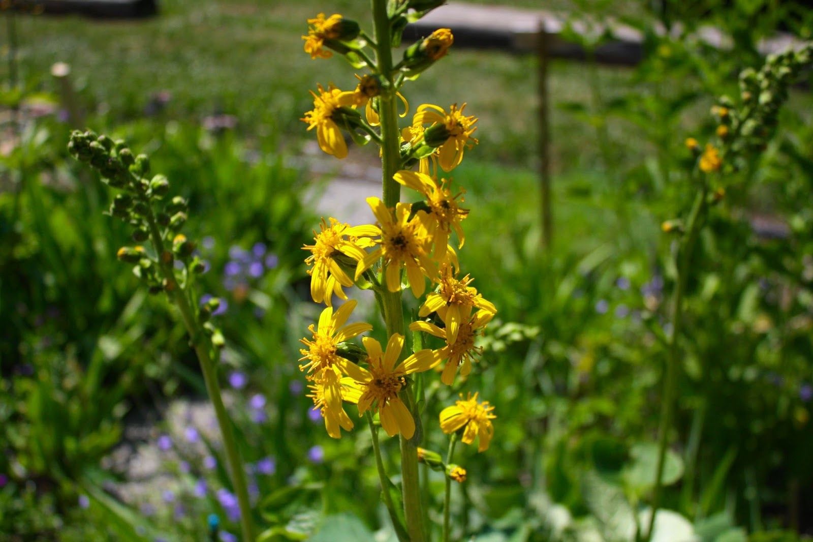 Ligularia ‘Othello’ is a bold perennial grown for its dramatic purple-tinged foliage and clusters of bright orange-yellow daisy-like flowers that bloom in midsummer. It prefers partial shade and moist, rich soil, making it ideal for woodland gardens or near water features. Native to Asia, Ligularia is valued for adding contrast and color to shaded areas. While not edible, it is deer-resistant and provides structure and late-season interest.