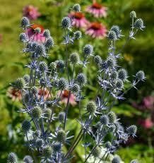 Sea Holly is a striking perennial known for its spiny, silvery-blue foliage and cone-shaped flowers surrounded by metallic blue bracts. Blooming in summer, it thrives in full sun and dry, sandy soil. Native to Europe and parts of Asia, it is deer-resistant, drought-tolerant, and used ornamentally in borders and dried flower arrangements. Historically, some species were used for treating snake bites.